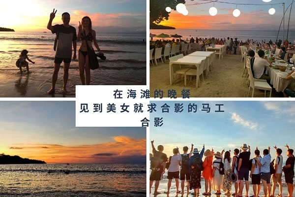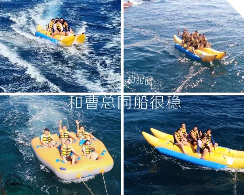 半小時后,我們首先到達(dá)了海中間由兩艘游輪搭建的漂浮“海上游玩基地”,除了“香蕉船”“甜甜圈”和“浮潛”這些項目,最有意思的是“跳?!?,作為非專業(yè)隊員,大家入水姿勢各異,激起巨大的浪花。遺憾的是,“女神”曹總并沒有參與“跳海”,估計她是為大家著想,怕入水海平面升高2米,淹沒“基地”,多年以后,我還是要感謝曹總的“不淹之恩”,讓我依然可以坐在在夕陽下回憶往昔。