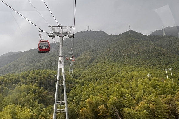 經過2個小時的車程,我們到達山腳下,但是又該怎么穿過群山,到達云端?答案就在下面,索道帶我們一步步接近秋空。這是一個2.3公里長的路程,43度至大傾角,落差有754米。坐在吊廂,一路領略那綠油蔥蔥。20分鐘的空中索道旅途,“↗→↘”,這就是我們經過的姿勢,由下而上、由仰到俯,過癮?。。。。?
