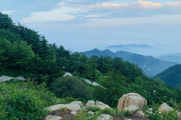 將近傍晚時分,天色似被一只無形的大手,緩緩地揉進(jìn)了灰暗的色調(diào)。山間的風(fēng),也裹挾著絲絲涼意,穿梭于林葉之間,我們一行人,于這漸暗的天色中艱難匯合。每個人的臉上都帶著攀登后的疲憊,卻又難掩眼中那股興奮與期待交織的光芒。稍作整頓,便又毅然決然地繼續(xù)朝著那高聳入云的玉皇頂上行。